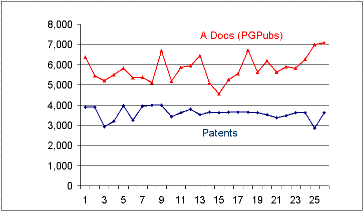 The graph above shows the “peaks and canyons” phenomena that has been so typical of U.S. patent counts over the past year. The “peaks” are spikes in the number of published A docs, gradually increasing in frequency and size over the past six months. Patent issues, on the other hand, are relatively stable from week to week with an occassional drop off that produces a “canyon” in the otherwise flat profile.